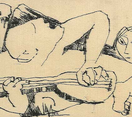 Auf Brettchen von Obstkistenholz hat Christine Rieck-Sonntag ihre Visionen des freien Eros mit der Tuschfeder gekratzt - sie brauchte den Widerstand des rauhen, sperrigen Materials für ihre Suche nach verborgenen Ursprüngen. Was ist aus Frau Orpheus geworden in diesem EU-Land von heute?